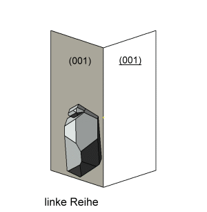 Auf den Darstellungen zu dieser Doppelreihe steht die Zone [012] am Orthoklas rechtwinklig zur Bildschirmebene und die Zwillingsebene liegt parallel zur senkrechten Bildschirmachse. Die kleine Animation links stoppt in dieser Stellung. |