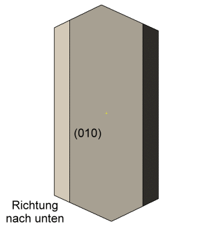 Die Stufe ist in den Abbildungen so ausgerichtet, dass die Fläche (100) am Orthoklas in der Bildschirmebene liegt und die b-Systemachse am Orthoklas nach rechts zeigt. Beim Stopp steht die kleine Animation links in dieser Ausrichtung. |