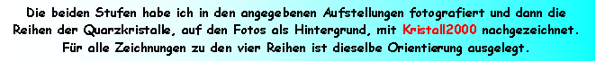 Fazit: Aktives Mineral im Sinne von Fersmann - hier „richtunggebend“ für den Quarz - ist der Orthoklas. Die interpretierten Reihen sind so betrachtet je ein Merkmal derselben Orientierung zwischen Orthoklas und Quarz wie oben beschrieben. Im Umkehrschluss bieten sich weitere reizvolle Betrachtungen an, z.B.: zeigt die 2.Reihe einen Bavenoer Zwilling an und die 4.Reihe gibt einen Hinweis zur Aufstellung des Feldspatkristalls auf dem sie gewachsen ist. |
